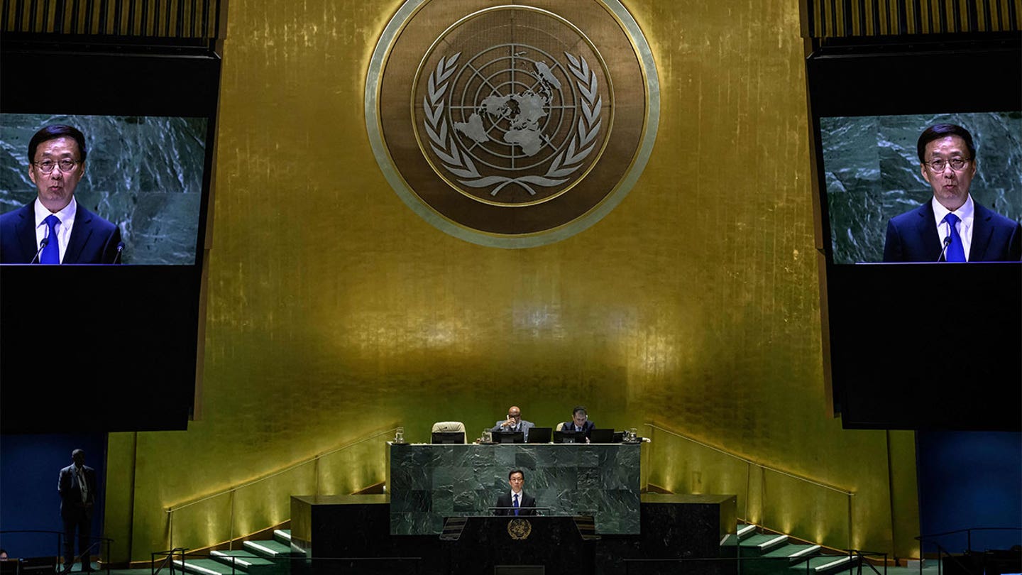 O vice-presidente da China, Han Zheng, discursou na 78ª Assembleia Geral das Nações Unidas na sede da ONU na cidade de Nova Iorque, em 21 de setembro de 2023. (Ed Jones/AFP por Getty Images)