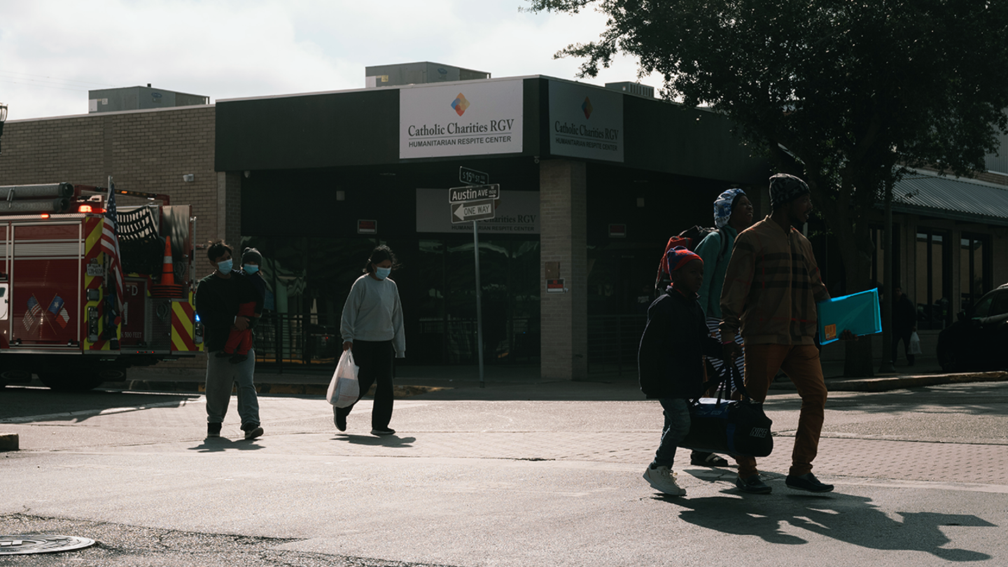 Foto externa do capítulo da Catholic Charities Rio Grande Valley com imigrantes no final de 2022. (Jordan Vonderhaar/Bloomberg via Getty Images)