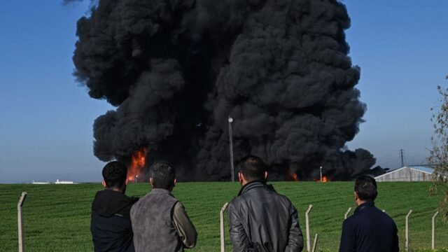 Pessoas observam nuvens de fumaça saindo de um armazém de petróleo na área de Kani Qirzhala, nos arredores de Erbil, capital da região autônoma do Curdistão do Iraque, após um suposto ataque de drone em 1º de abril de 2026.