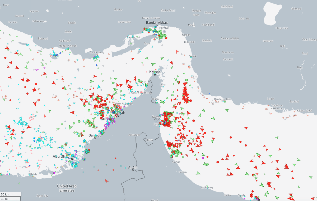 O mapa, da MarineTraffic, que rastreia o transporte marítimo global, mostra o acúmulo de navios em ambos os lados do estreito após ameaças iranianas a navios que utilizam a hidrovia e relatos de ataques de mísseis e drones iranianos a estados árabes do Golfo que hospedam bases dos EUA.