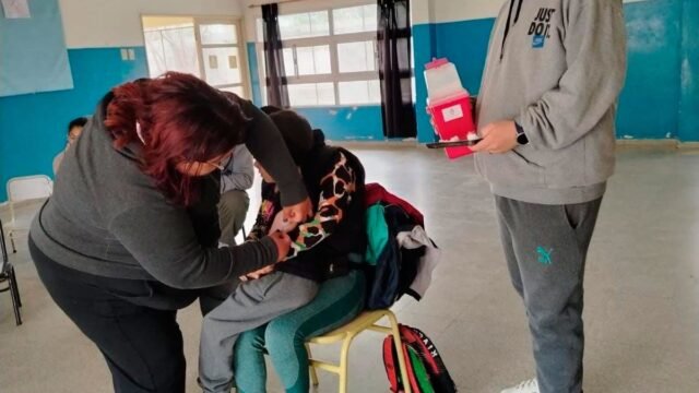 Município de La Banda, através do Ministério da Saúdeda escola entrando na oficina de vacinação Jardim de Infância Provincial nº 808 do bairro Paraíso, destinado a meninos e meninas de 5 e 6 anos