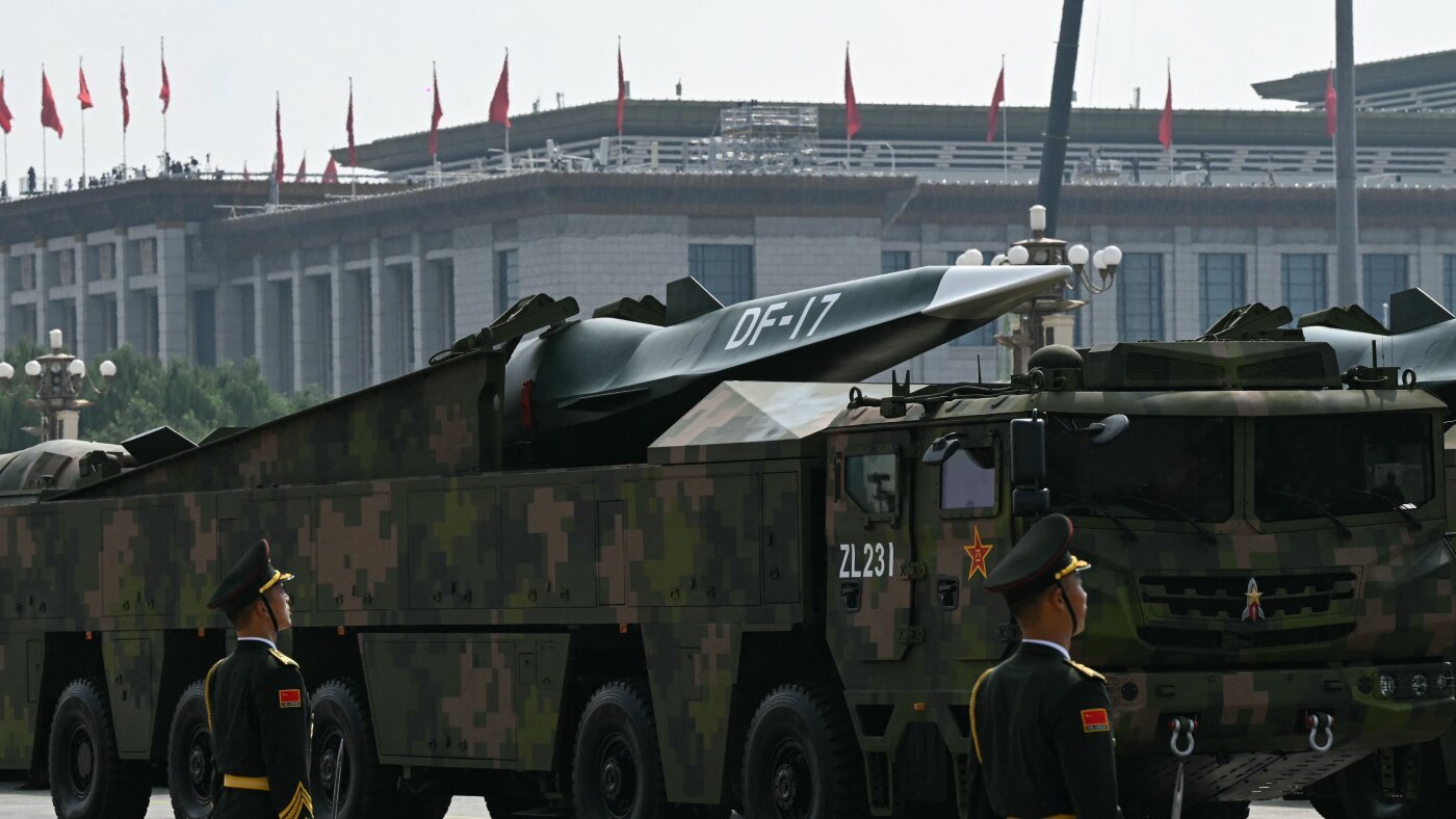 Um míssil balístico rodoviário móvel de médio alcance DF-17 é visto durante um desfile militar na Praça Tiananmen, em Pequim, em 3 de setembro de 2025. A China pode querer desenvolver novas armas nucleares para suas armas hipersônicas.