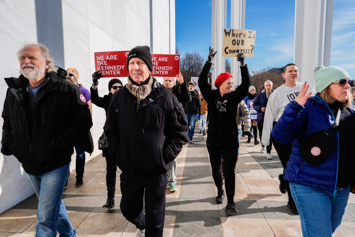Van Hollen juntou-se aos manifestantes que se opunham à mudança de nome do Kennedy Center no sábado, dizendo à multidão que adicionar o nome de Trump ao edifício “profanaria o Kennedy Center”. Os manifestantes seguravam cartazes com os dizeres “Nós somos o Kennedy Center”, “Trump, não JFK” e “Faça arte, lute contra os fascistas”.