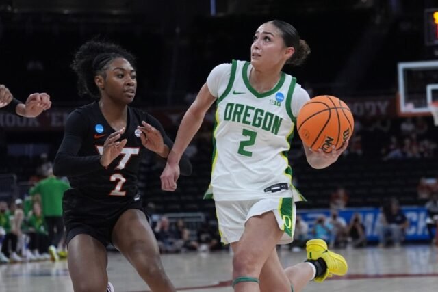 AUSTIN (KXAN) – Oregon saiu furioso com uma vitória por 70-60 sobre Virginia Tech na rodada de abertura do Women’s March Madness na sexta-feira no Moody Center. O oitavo colocado Ducks acertou 71% do campo no primeiro quarto, construindo uma vantagem de 22-11 sobre o nono colocado Hokies em Fort Worth (…)