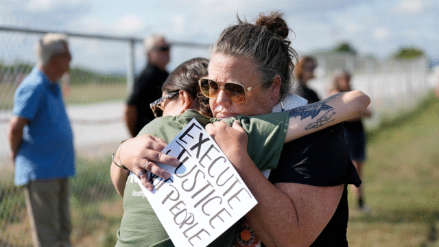 Reverendo India Pangercher, à esquerda, enquanto manifestantes se reúnem em uma área reservada para manifestantes anti-pena de morte fora da Instituição de Segurança Máxima Riverbend antes da execução de Byron Black, terça-feira, 5 de agosto de 2025, em Nashville, Tennessee. Ingrid abraça McIntyre. (AP)