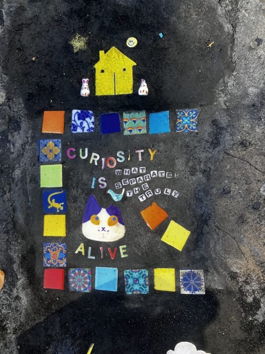 Eles começaram a preencher buracos nas calçadas com figuras de dinossauros e a partir daí passaram a fazer mosaicos.