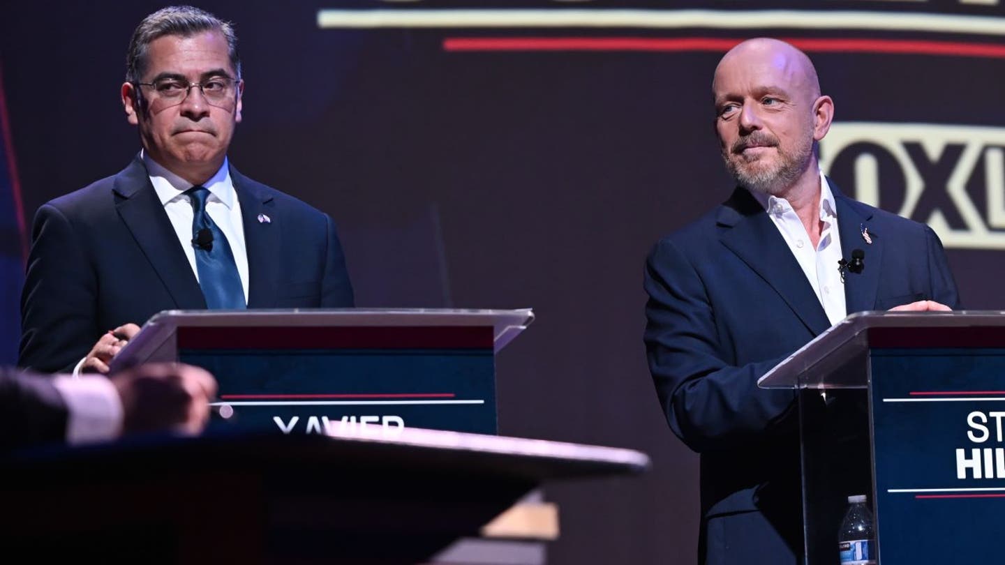 Javier Becerra, à esquerda, e Steve Hilton participam de um debate para governador da Califórnia na terça-feira, 3 de fevereiro de 2026, em São Francisco. (Foto AP/Laur Andrillon)