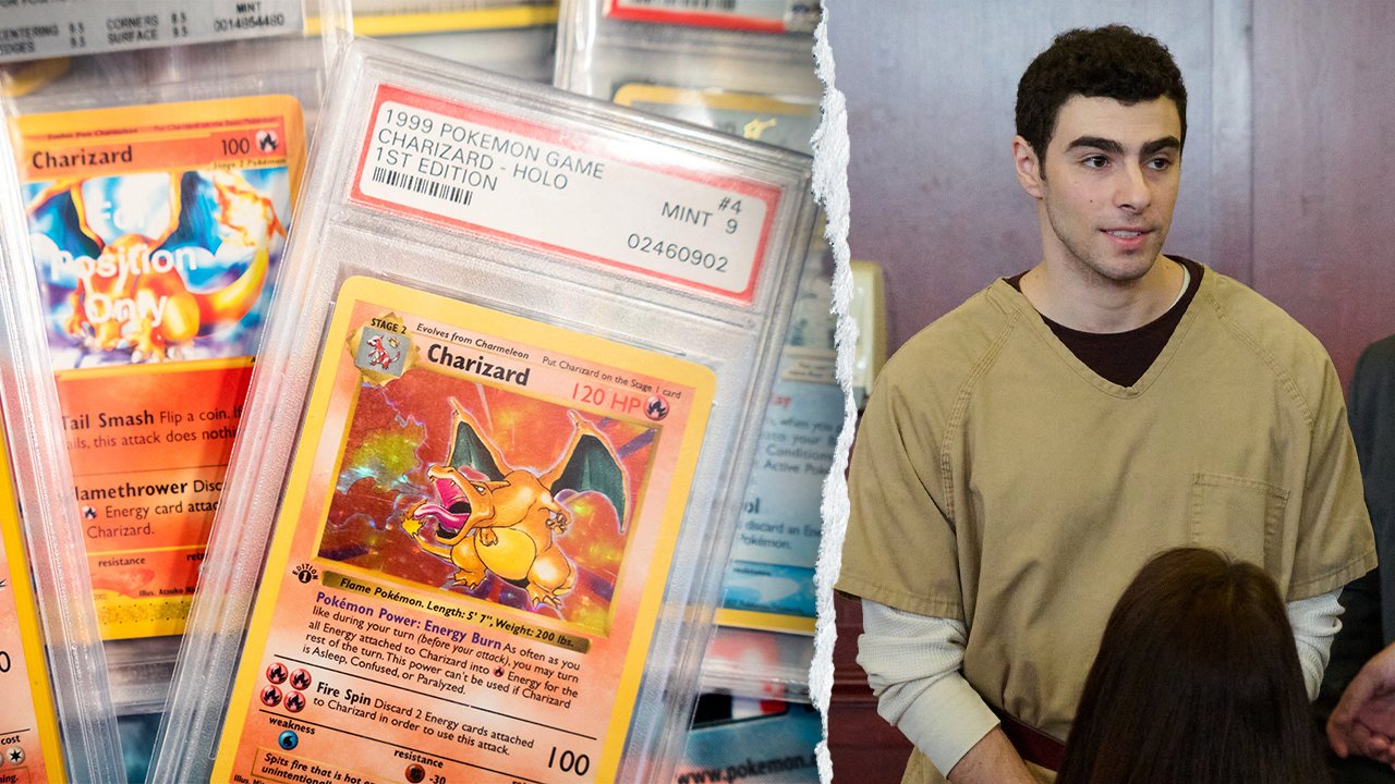 Esta imagem dividida mostra uma pilha de cartas “Pokémon” colecionáveis e Luigi Mangione aparece no tribunal para seu julgamento por acusações de homicídio estadual no assassinato do CEO da UnitedHealthcare, Brian Thompson, na Suprema Corte de Manhattan em 16 de setembro de 2025 na cidade de Nova York. (Ida Marie Odgaard/Ritzau Scanpix/AFP via Getty Images, Curtis Means-Pool/Getty Images)