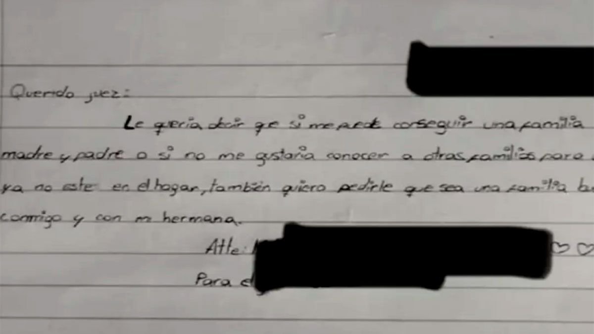 Por trás de cada processo judicial há histórias impressionantes. E alguns, assim Duas irmãs de Salta, que arrasaram nos papéis transversais. Eles têm 10 e 12 anos e são provenientes de um lar adotivo e decidem escrever uma carta a um juiz que irá intervir no seu caso.. Em suas próprias cartas manuscritas, eles fazem um apelo comovente: eles querem uma família e a querem logo.