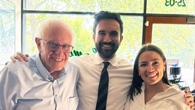 O senador Bernie Sanders, o candidato democrata a prefeito Zohran Mamdani e a deputada Alexandria Ocasio-Cortez posam para uma foto em 6 de setembro de 2025 em Astoria, Queens. (@X por ZohranKMamdani)