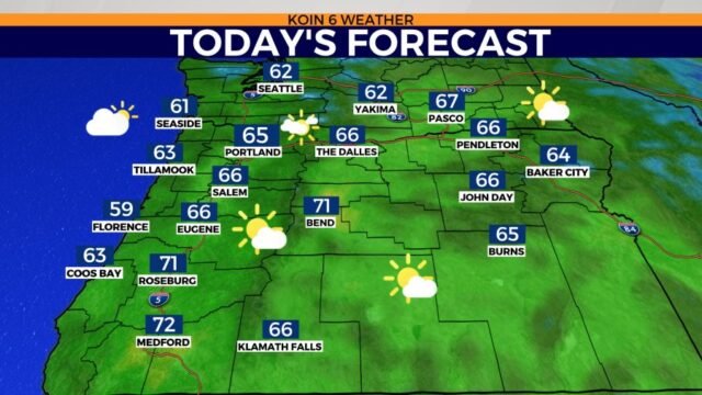 O clima úmido e ventoso esfriará as temperaturas da área de Portland até meados dos anos 50. Espera-se que as mínimas noturnas caiam para 40 graus no início da próxima semana, à medida que o tempo úmido e nublado começa a melhorar. As temperaturas próximas da média retornarão ao noroeste do Pacífico em meados da próxima semana.