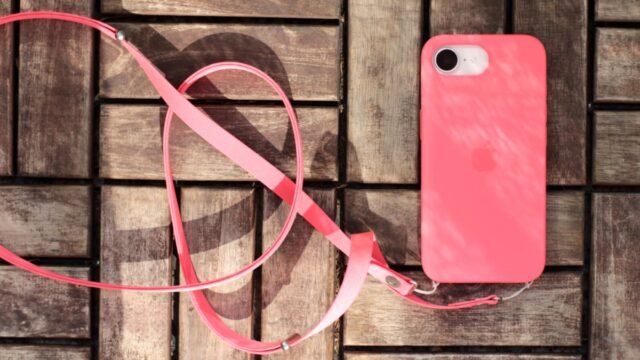 A capa de silicone para iPhone 17e em Bright Guava pode ser fixada na alça crossbody da Apple.