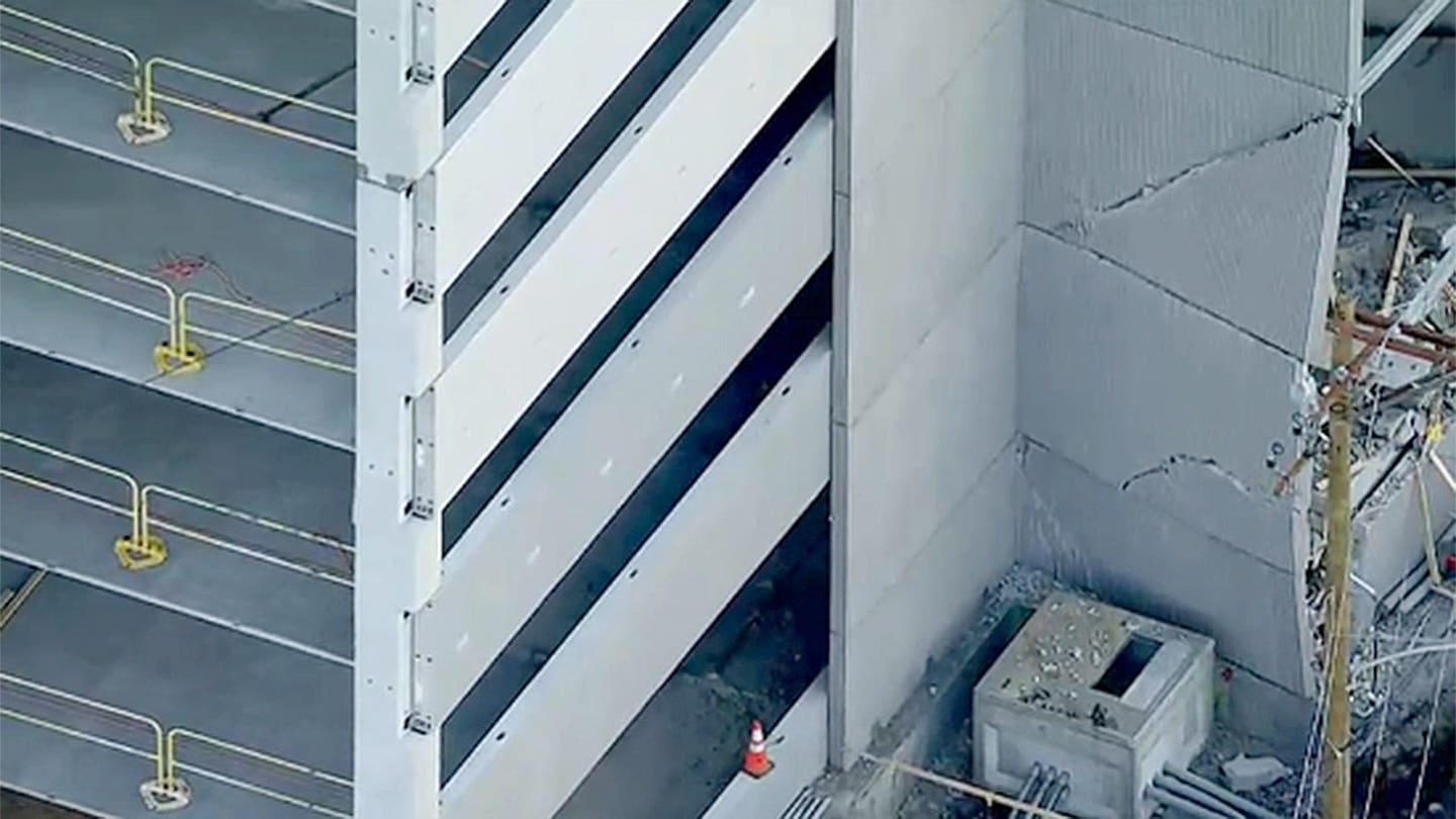 Rachaduras são vistas em um estacionamento na Filadélfia na quinta-feira, 9 de abril de 2026, depois que ele desabou parcialmente no dia anterior. (WTXF)