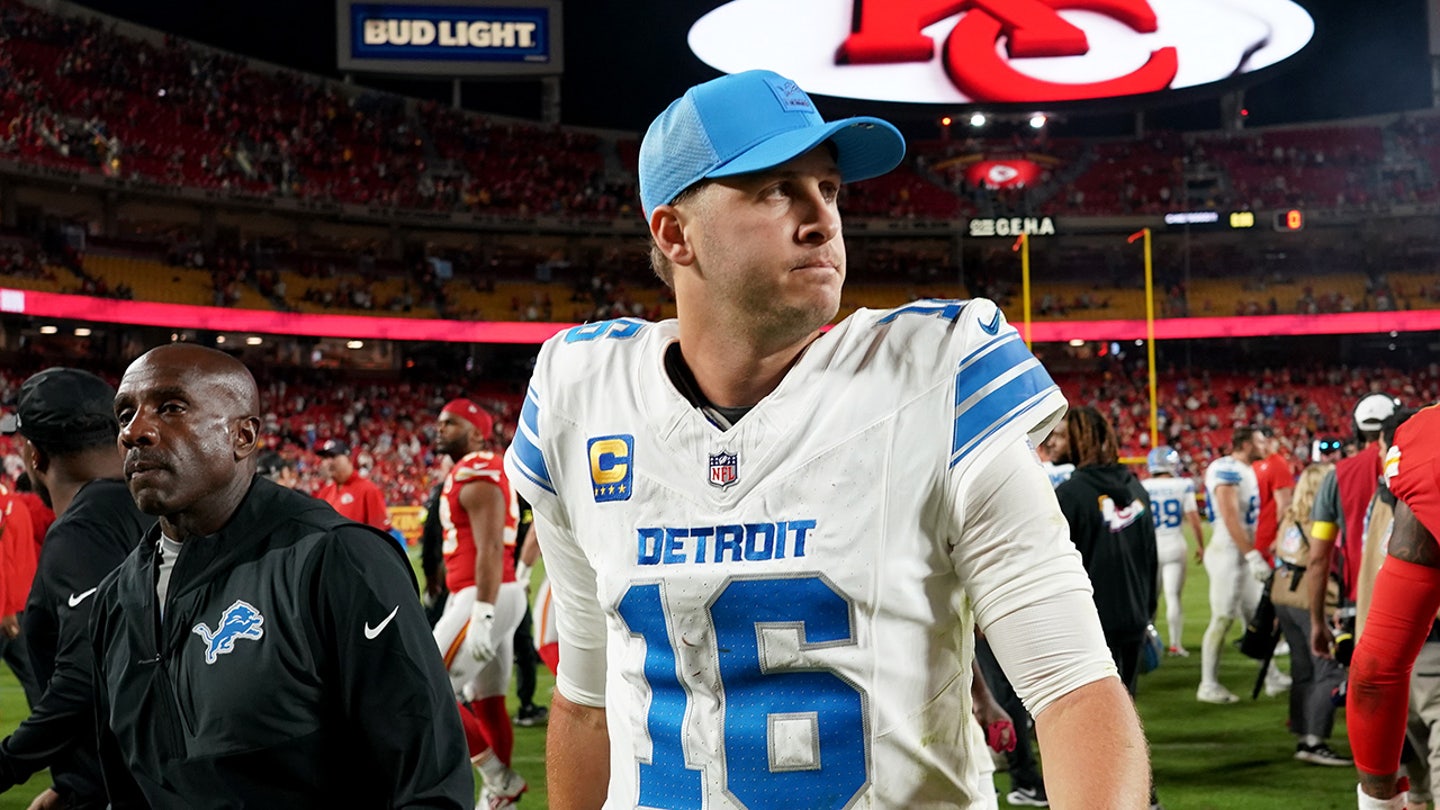 O quarterback do Detroit Lions, Jared Goof, está em 12 de outubro de 2025, após o jogo de futebol americano da NFL contra o Kansas City Chiefs em Kansas City, Missouri, Missouri. (Ed Jurga/Foto AP)
