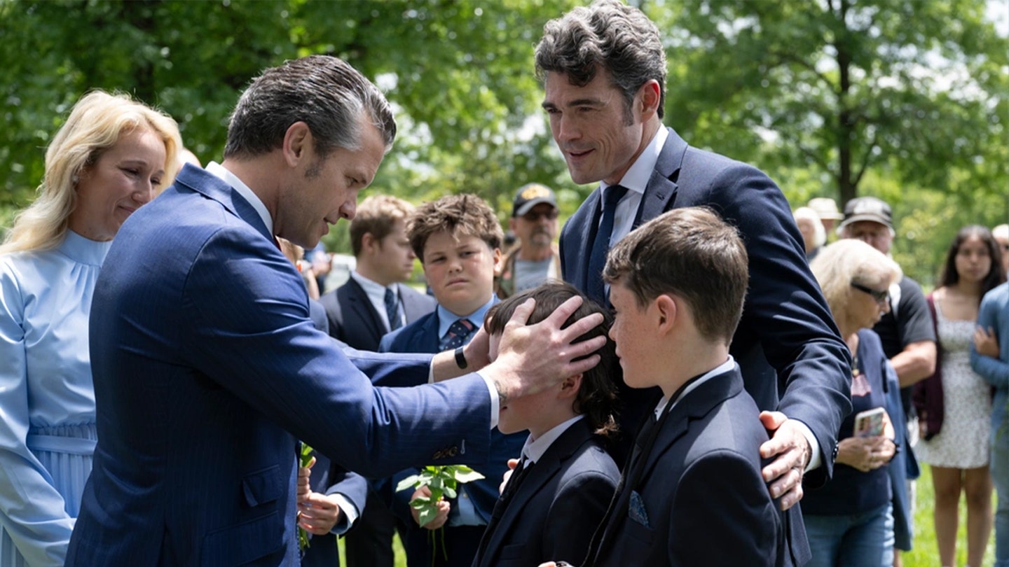 O secretário da Guerra, Pete Hegseth, cumprimenta um dos filhos de Joe Kent. O ex-Diretor Nacional de Contraterrorismo é pai de dois filhos e cônjuge Gold Star. (Foto do Exército dos EUA por Elizabeth Fraser/Cemitério Nacional de Arlington)