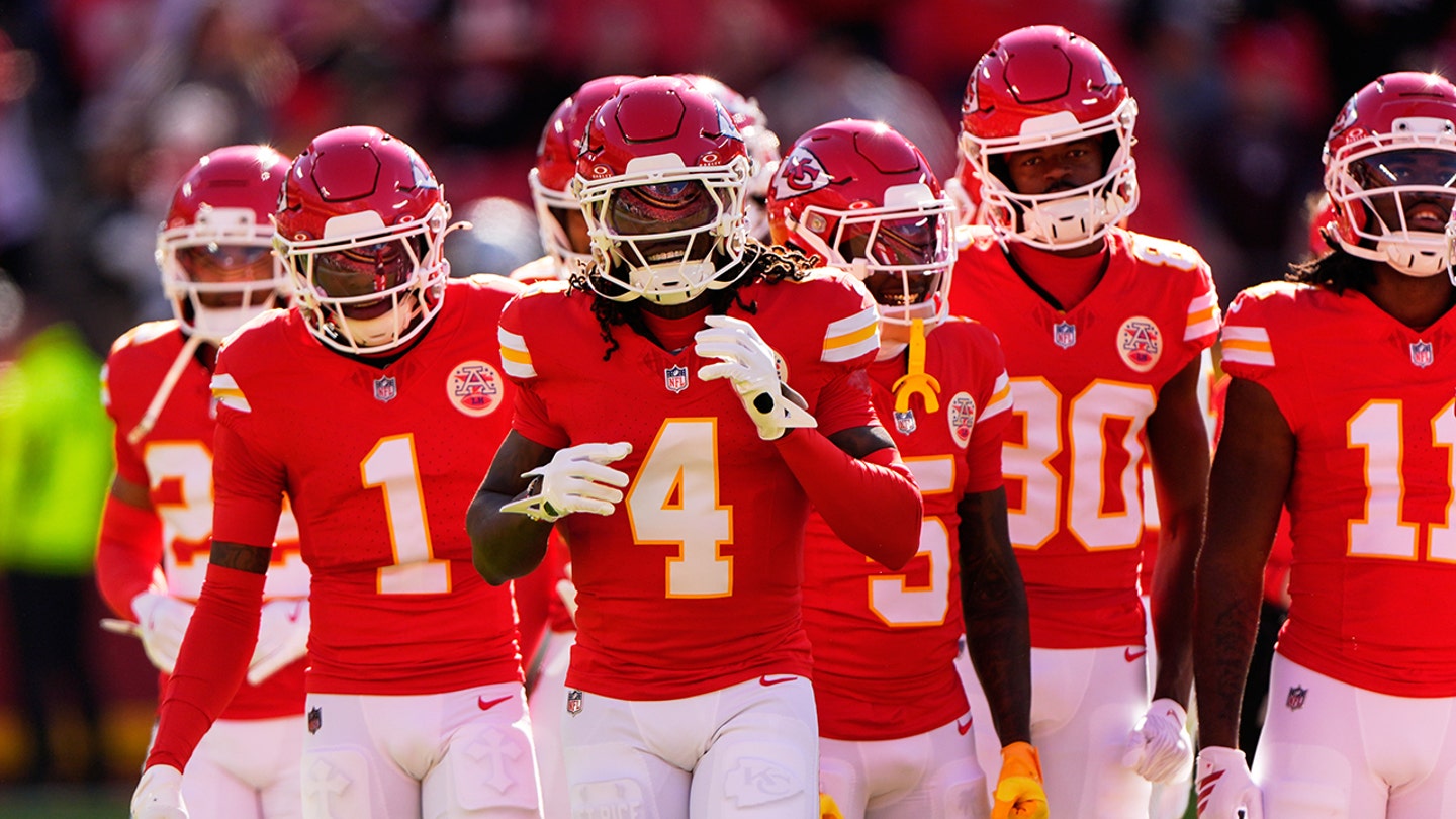 O wide receiver do Kansas City Chiefs, Rashee Rice (4), se aquece com companheiros de equipe antes de um jogo de futebol americano da NFL contra o Las Vegas Raiders, domingo, 19 de outubro de 2025, em Kansas City, Missouri. (Foto AP/Charlie Riedel)