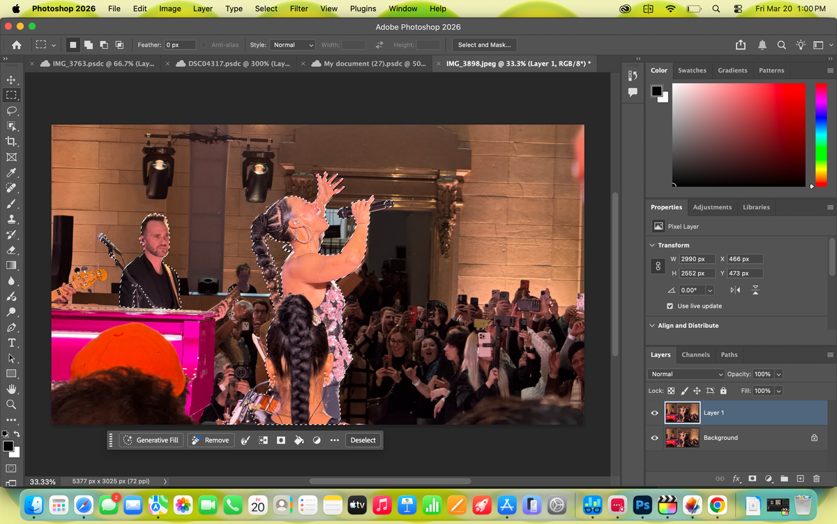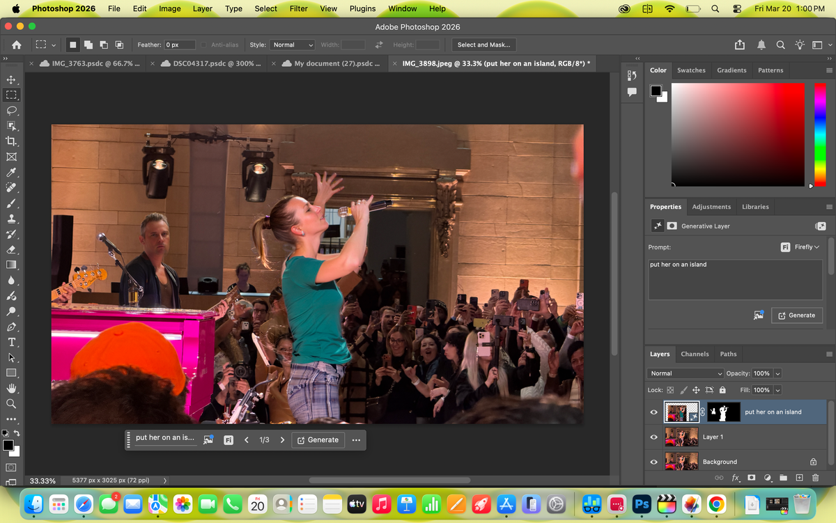 Não havia necessidade de se preocupar. Instalei facilmente o Adobe Creative Cloud e o Photoshop e comecei a manipular várias camadas de fotos. Eles até rodaram IA e pediram ao Adobe Firefly para escolher um tema (Alicia Keys cantando no evento do 50º aniversário da Apple) e então substituir Keys por outra pessoa fazendo exatamente a mesma coisa. Demorou um pouco, mas funcionou.