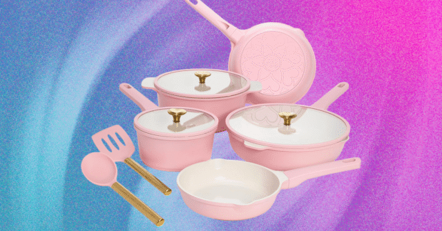 Este conjunto de panelas Paris Hilton teria sido o presente perfeito para mim quando comprei meu apartamento. Infelizmente isso foi há 10 anos. (Fique ligado em nosso guia de compra de panelas antiaderentes em breve!)