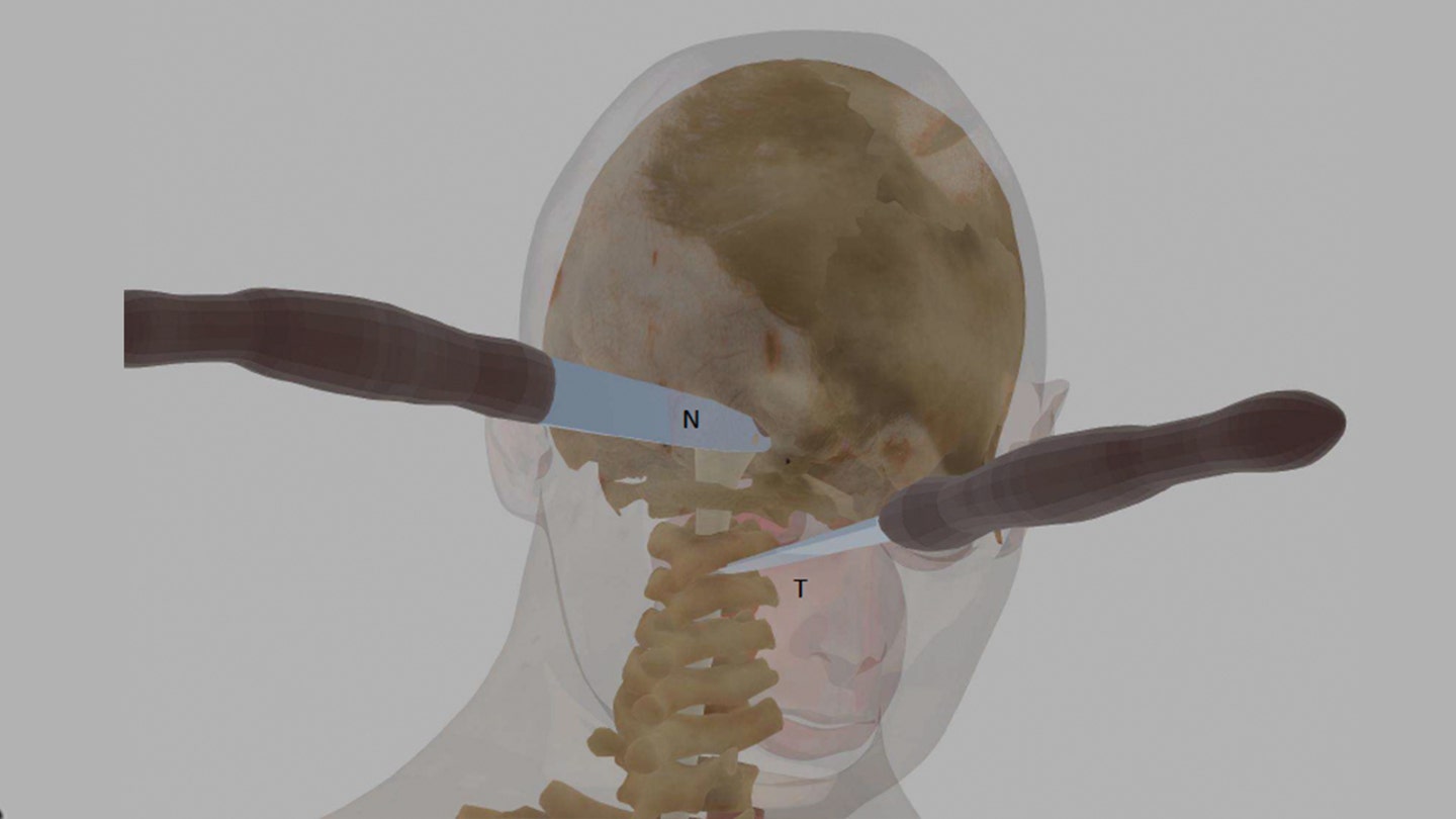 Ilustração de computador mostrando duas facadas no pescoço e na nuca de Ellen Greenberg. (Tom Brennan)