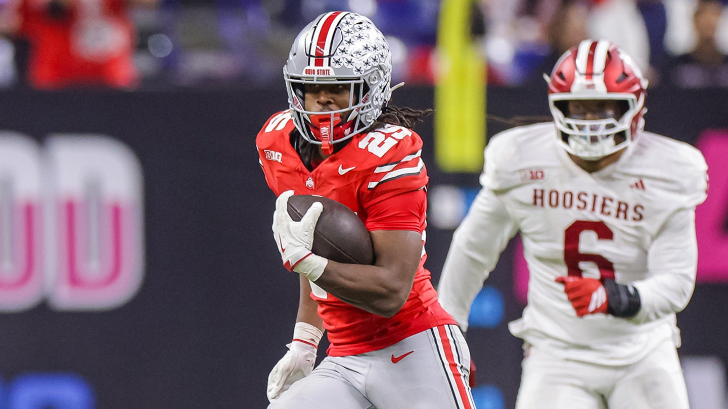Bo Jackson #25 do Ohio State Buckeyes conduz a bola contra o Indiana Hoosiers durante o 2025 Big Ten Championship Game no Lucas Oil Stadium em 6 de dezembro de 2025 em Indianápolis, Indiana. (Michael Hickey/Imagens Getty)