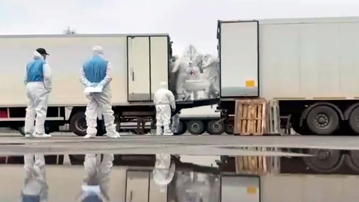 Imagens divulgadas por uma agência estatal russa de repente Eles mostraram Homens de macacão branco e luvas azuis transportam sacos para cadáveres de um caminhão para outro veículoObservadores do Comité Internacional da Cruz Vermelha estiveram presentes durante o processo.