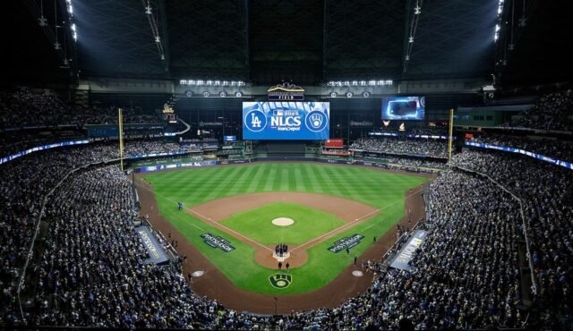 Uma visão geral do campo externo do American Family Field antes do jogo 1 da National League Championship Series entre Los Angeles Dodgers e Milwaukee Brewers na segunda-feira, 13 de outubro de 2025, em Milwaukee, Wisconsin. (Fotos de Aaron Gasch/MLB via Getty Images)