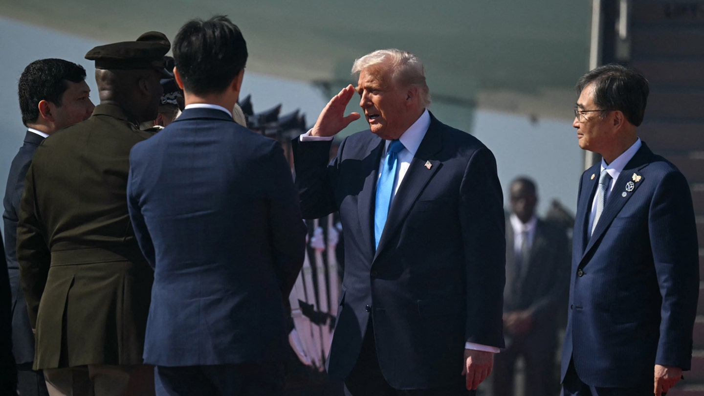 O presidente dos EUA, Donald Trump, é recebido por autoridades sul-coreanas ao chegar ao aeroporto de Gyeongju em 29 de outubro de 2025. (Andrew Caballero-Reynolds/AFP via Getty Images)