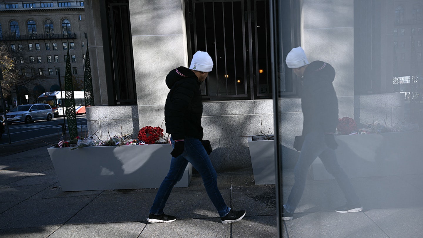 Um homem passa por um memorial improvisado em homenagem a dois militares da Guarda Nacional que foram baleados perto da estação de metrô Farragut West em 28 de novembro de 2025, em Washington. (Brendan Smialowski/AFP via Getty Images)
