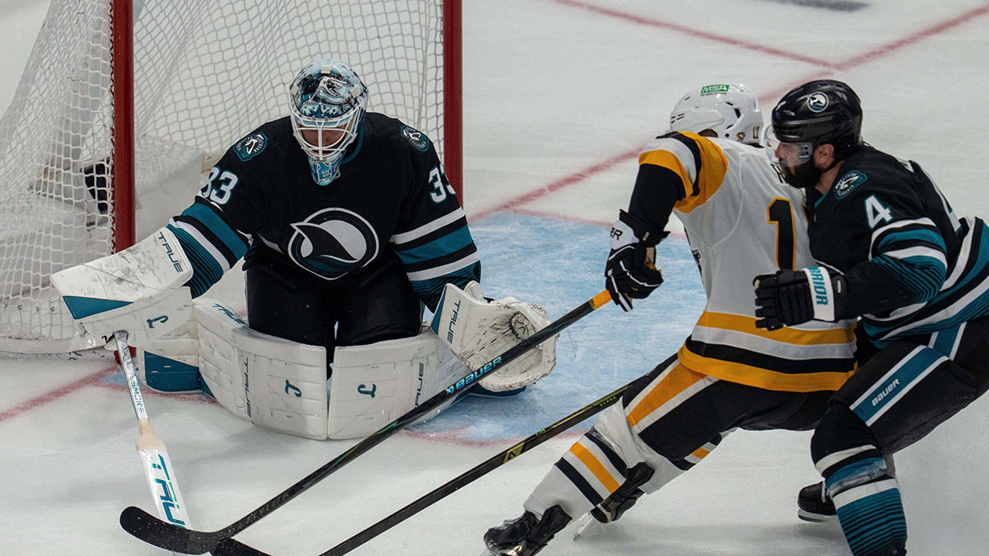 O goleiro do San Jose Sharks, Alex Nedeljkovic (33), faz uma defesa contra o ala direito do Pittsburgh Penguins, Bryan Rust (17), enquanto o defensor do San Jose Sharks, Nick Leddy (4), faz a defesa no SAP Center em 18 de outubro de 2025 em San Jose. (Neville E. Gard/Imagine Imagens)