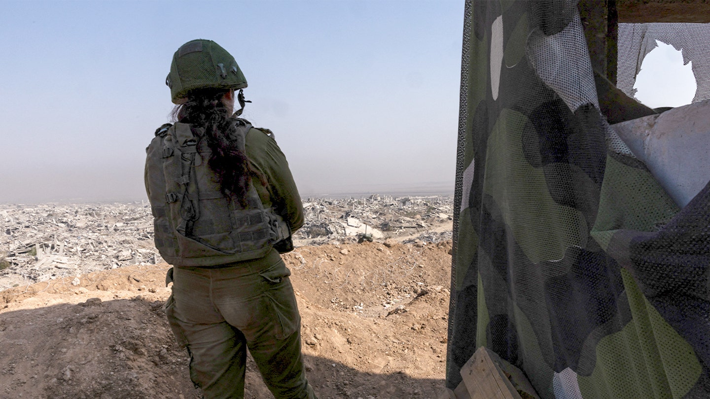 Um soldado israelense examina edifícios destruídos vistos de um posto de guarda em um posto militar israelense na fronteira da “Linha Amarela” no bairro de Shujaya, na parte oriental da Cidade de Gaza, na Faixa de Gaza, em 5 de novembro de 2025. (Nir Elias/Reuters)