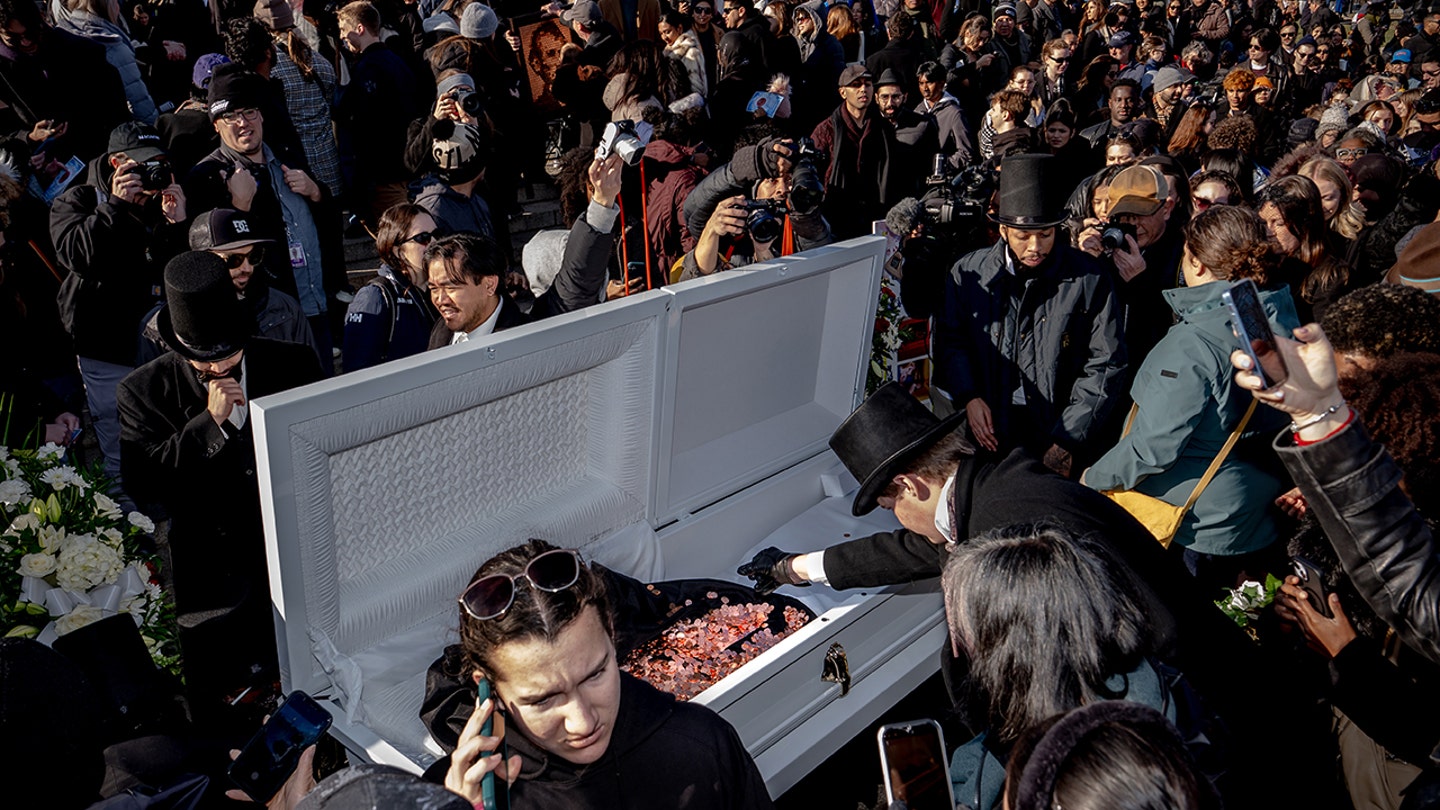 As pessoas se reúnem para jogar moedas no caixão durante o funeral de Mack para Penny, que foi suspensa em frente ao Lincoln Memorial em Washington, no sábado, 20 de dezembro de 2025, no início deste ano. (Foto AP/Julia Demarie Nikhinson)