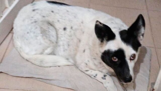 O cachorro é gordinho, tem pêlo curto, quadril caído, está desnutrido e tem problemas de visão em ambos os olhos..