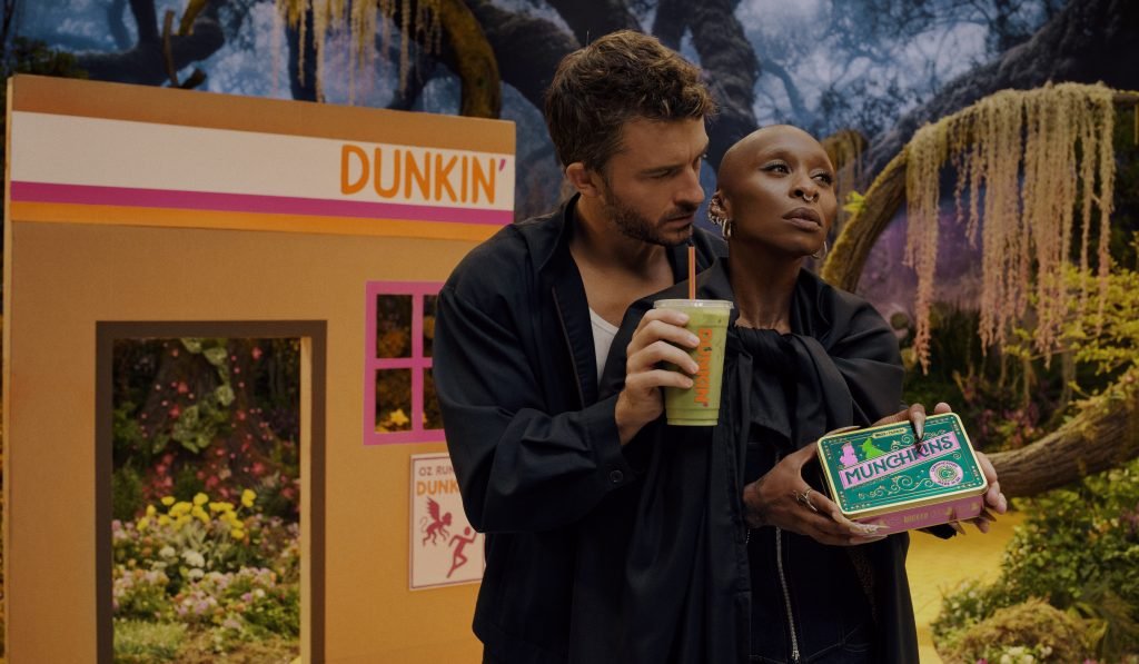 Novo em Malvado: para sempre era Dunkin’ Donuts (ímpio Starbucks teve um ano). Quais são os melhores parceiros? Porque Dunkin ‘Donuts é realmente legal da Geração Z. A rede de donuts de café é conhecida por fazer anúncios discretos que aparecem nas redes sociais com seu tom diferente. A multidão de 13 a 24 representou quase um terço Malvado: para sempreo autor do fim de semana. A Dunkin’ executou uma campanha global de marca conjunta que abrangeu momentos na loja, fora de casa, digitais, sociais e de influência. Os drinks terminaram com Elphaba e Glinda, os Munchkins com listras verdes e rosa reunidos em uma piscina, com tema de mercadorias, e este spot com Erivo e Jonathan Bailey com o humor característico de Dunkin;