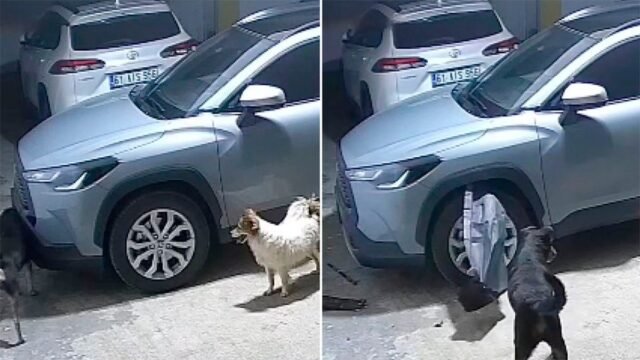 Foi registrado vandalismo canino ocorrido em um estacionamento na cidade turca de Trebizond verifiquei as câmeraso proprietário do veículo teve que declarar o ocorrido.