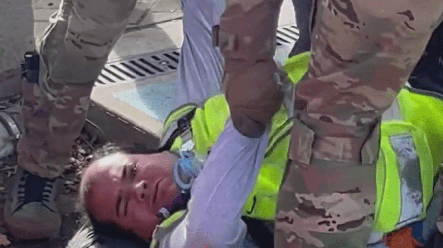 Um homem cego é parado e preso por agentes federais em uma instalação do ICE em Portland, outubro de 2025 (KOIN).