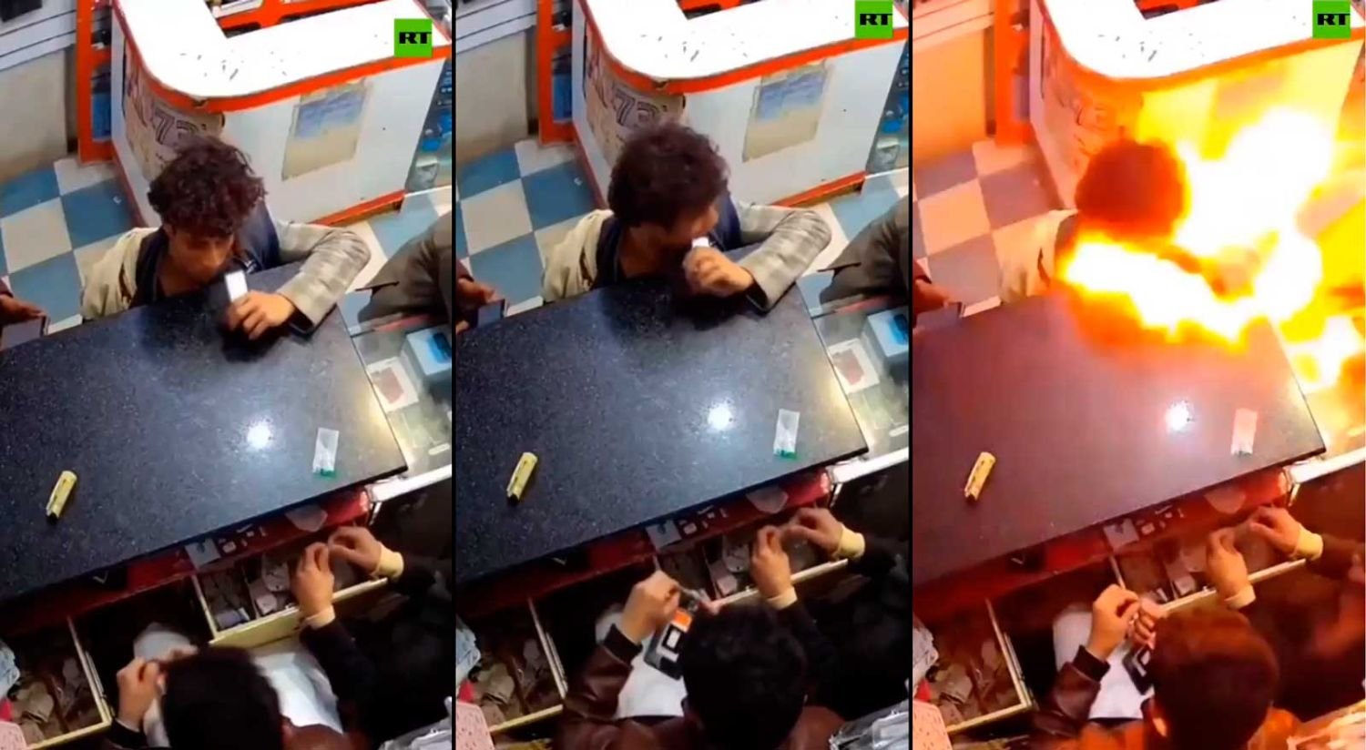 Um homem em Índia Um vídeo dele decidindo morder a bateria do telefone se tornou viral nas redes sociais Explode na boca deleCriando uma bola de fogo que cobre todo o seu rosto.